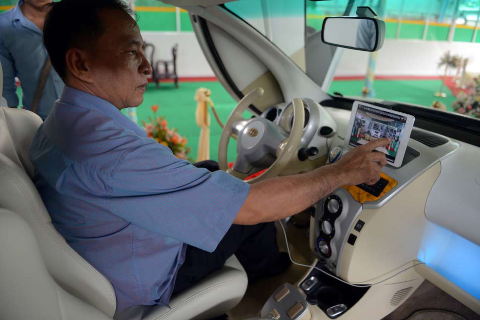 Nhà thiết kế Nhean Phalloek đang kiểm tra màn hình cảm ứng bên trong chiếc Angkor EV 2013, được biết ô tô điện còn được lắp đặt công nghệ quét dấu vân tay để mở cửa và sử dụng thẻ điện tử thay cho khóa để khởi động máy. Thiết kế này của ông thực sự khiến cho nhiều người phải trầm trồ, thán phục và không ít người những người dân Việt Nam, những người luôn mong muốn có một chiếc xe hơi vừa túi tiền, phải… “phát thèm”.